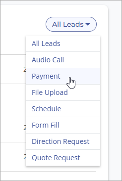 To filter for a specific type of lead, click on the All Leads drop-down, and select a lead type from those available. The available lead types include: