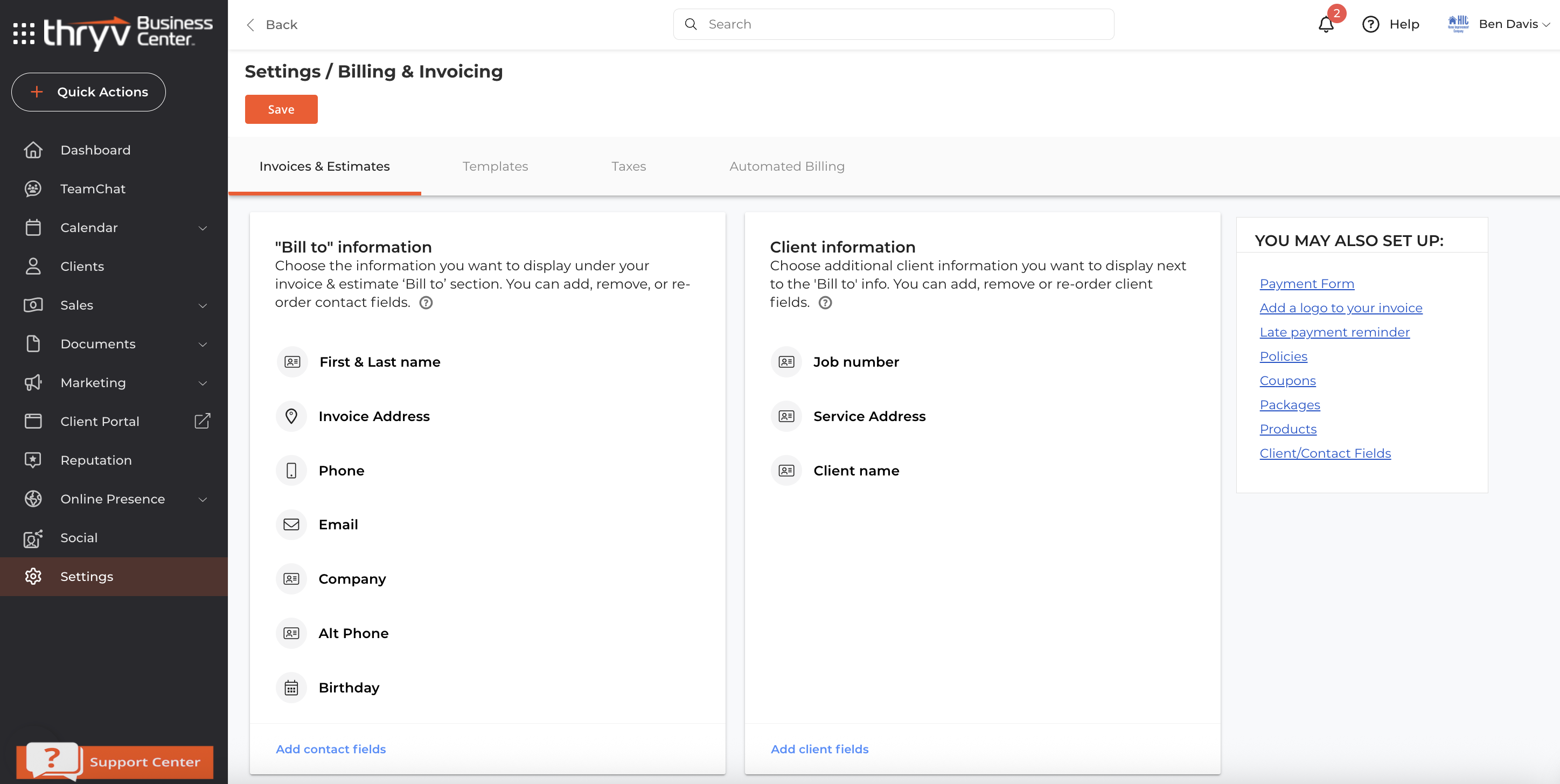 First, you'll need to make sure that VIN number is a field created on your client cards. This is done under Settings,then Client and Contact Info. Click Here for a guide to this process.Then, you'll need to make sure this field appears under Client Information on your invoices. To do this, navigate to Settings,then Billing & Invoicing.