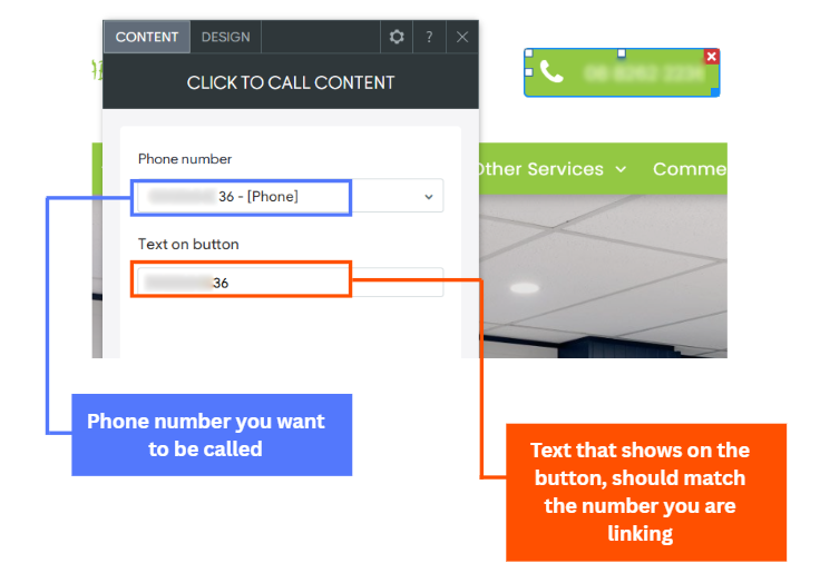 When you click on that widget, you should get a box to edit the button (example below). Ensure the Phone number box has the number you want to be called when its clicked on the the Text on button will act as a label, ensure that number is identical to the other box. Once both are in there, make sure the changes are saved and re-publish your site for the changes to be live.