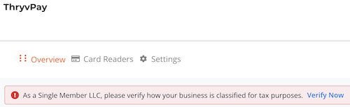 Great question! If you are an LLC and have this banner in your ThryvPay account, you are able to click on Verify Now and make the change directly. Otherwise, you must contact ThryvPay support at 1-888-479-8729 or email at thryvpay@thryv.com
