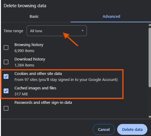 Ensure the Time range is set for All Time and that you have both check boxes for Cookies and other site data and Cached images and files selected. Then click Delete Data